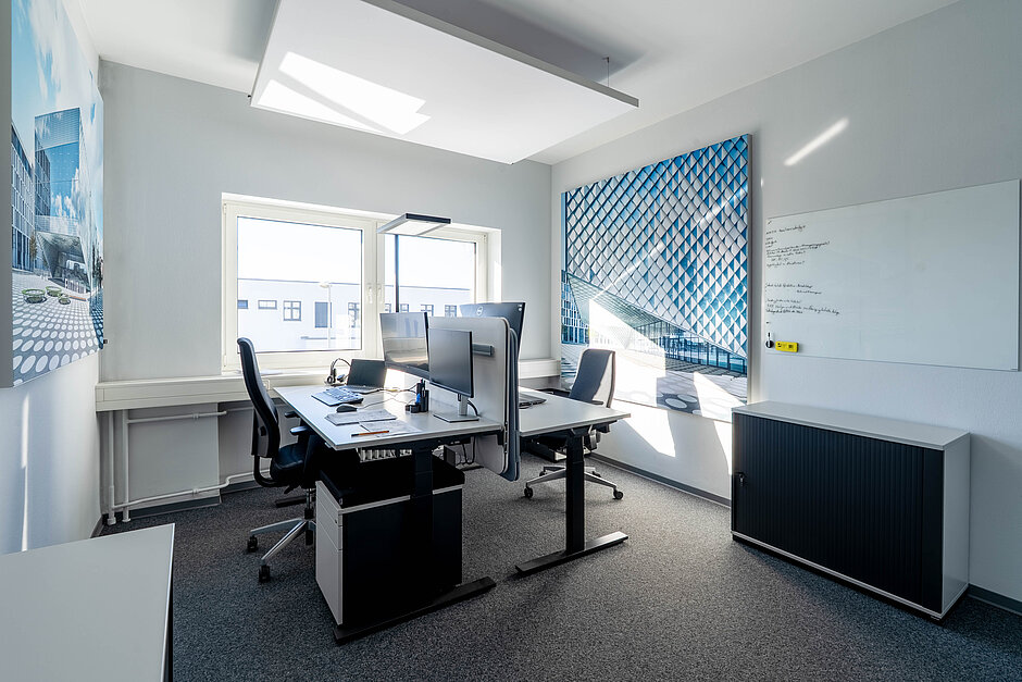 Unser Büro- und Verwaltungsgebäude hat drei Etagen auf denen die verschiedenen Abteilungen untergebracht sind. Die Büroaufteilung ist ganz unterschiedlich. Vom Einzelbüro bis zum Großraumbüro gibt es alles. Allerdings sind die meisten Kollegen in 2er - 4er Büros untergebracht. Alle Mitarbeiter haben in der Regel einen festen Arbeitsplatz mit Rollcontainer, Sideboard, höhenverstellbaren Schreibtisch, verstellbaren Schreibtischstuhl und Monitor sowie einer Tageslichtlampe. Darüber hinaus erhält jeder Mitarbeiter einen Laptop, um flexibel arbeiten zu können. Egal ob schnell es ins Meeting gehen muss oder du mobil von zu Hause arbeiten willst. Außerdem sind die Büroarbeitsplätze mit Pflanzen und Schallabsorbern ausgestattet, damit du dich in Ruhe auf deine Aufgaben konzentrieren kannst. Unsere Arbeitsplätze passen sich an Dich an!